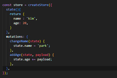 <button @click="$store.commit('changeName')">버튼눌러서 store 수정해버리기</button>