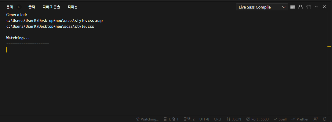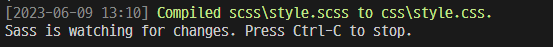 scss파일의 내용을 변경 했을 때, 터미널에 다음과 같은 문구가 나타나면 컴파일 성공!