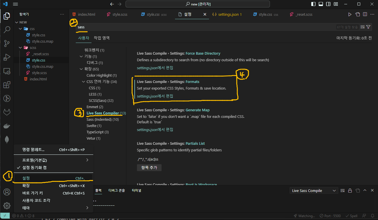 설정(ctrl + ,) - 검색창에 sass 검색 - 사이드바에서 Live Sass Compiler 선택 - ssettings.json 편집