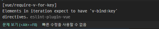 이때, v-for 안에 value는 기본으로 들어가야 하는 사항이다. index는 선택사항이긴 하지만 :key 바인딩을 할 때 필요하므로 그냥 넣어주도록 하자. :key는 필수적인 요소이다. vue 공식문서에 있는 예제를 보면 :key 없이 잘 랜더링 되는 것을 볼 수 있지만, 막상 vscode 에서 실행해보면 lint가 오류를 뱉어내는 것을 볼 수 있다. 그리고 공식문서에서 "key"를 제공하라고 명시하고 있기도 하니 꼭 넣어주자.