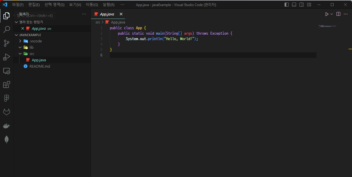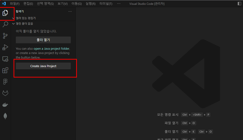 익스텐션들이 제대로 깔렸다면, 탐색기 버튼을 눌렀을 때 Create java Project 버튼이 나타날 것이다.