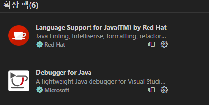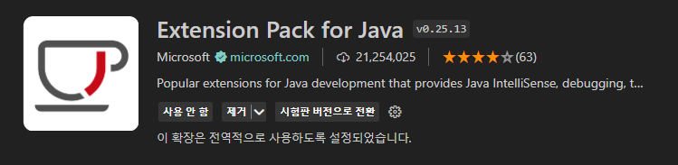 마켓플레이스에서 Extension Pack for Java 를 검색해서 설치하면 다음과 같은 추가 익스텐션이 딸려온다. 지우지말고 놔두자. 다 쓴다.