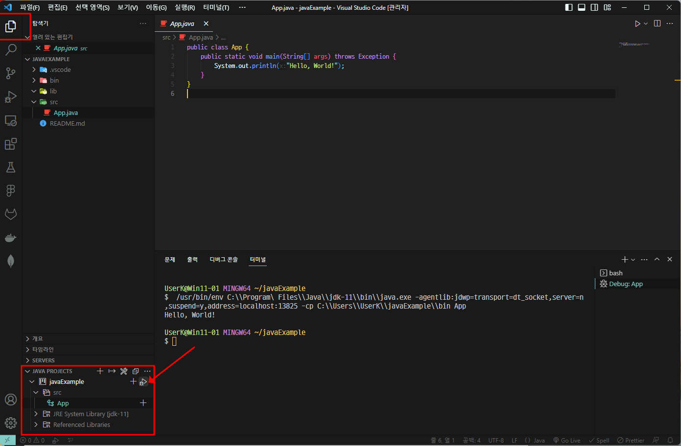 탐색기 > 화면 좌측 하단의 java project > 벌레그려져있는 버튼 누르기