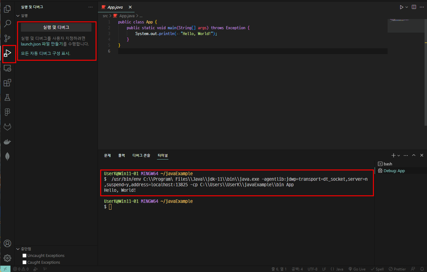 좌측 실행바에서 벌레가 그려진 버튼 클릭 > 실행 및 디버그 버튼 클릭