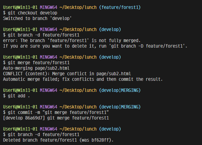 git merge feature/forest2 // forest2 브랜치를 develop 브랜치에 합쳐라.