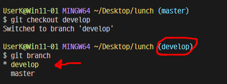 터미널을 보면, () 내부가 마스터에서 디벨롭으로 변한것을 알 수 있다.