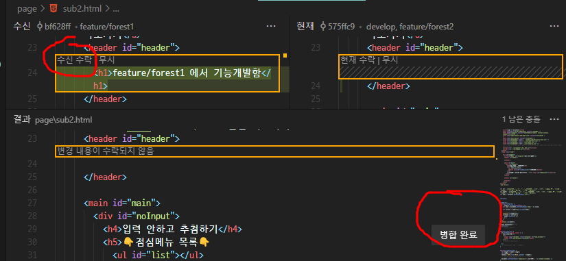 일단은 수신된 내용을 수락하고 병합을 완료 한다.