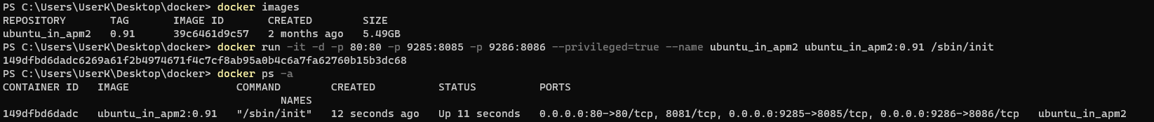 docker run -it -d -p 80:80 -p 9285:8085 -p 9286:8086 --privileged=true --name ubuntu_in_apm2 ubuntu_in_apm2:0.91 /sbin/init